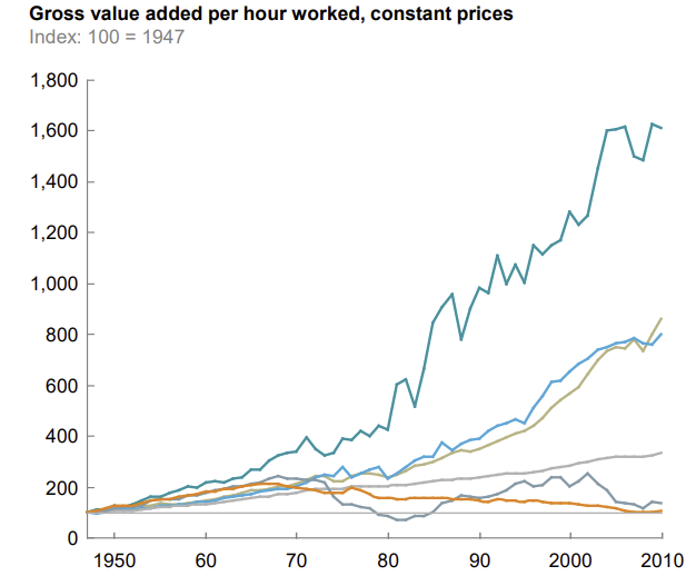 All sectors except construction (Orange) have exploded in productivity since the 50s. Agricultural productivity, for example, has doubled four times! What about Construction? Well, between 1947 and 2010, the annual growth rate was 0.1%.